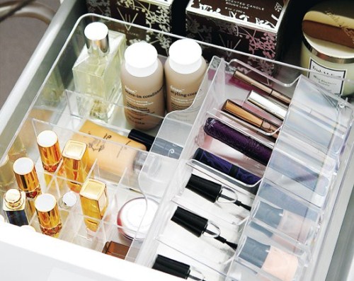 Se você tiver um cantinho onde fiquem todas as maquiagens e queira algo para deixá-las expostas, é melhor investir nos potinhos, como foram citados acima, e também nas caixas e bases de acrílico com divisórias. Elas possuem espaços certinhos para os batons, onde eles ficam posicionados em escala, além dos espaços maiores que cabem perfeitamente os pós, blushes, corretivos e as bases em pé.